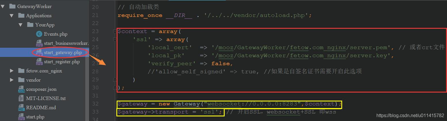 ②. 然后修改了【gatewayWorker 服务器】中的 start_gateway.php文件,以支持 WSS 服务