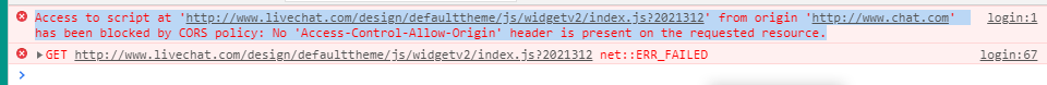 Access to script at 'http://www.livechat.com/design/defaulttheme/js/widgetv2/index.js?2021312' from origin 'http://www.chanliaokf.com' has been blocked by CORS policy: No 'Access-Control-Allow-Origin' header is present on the requested resource.
